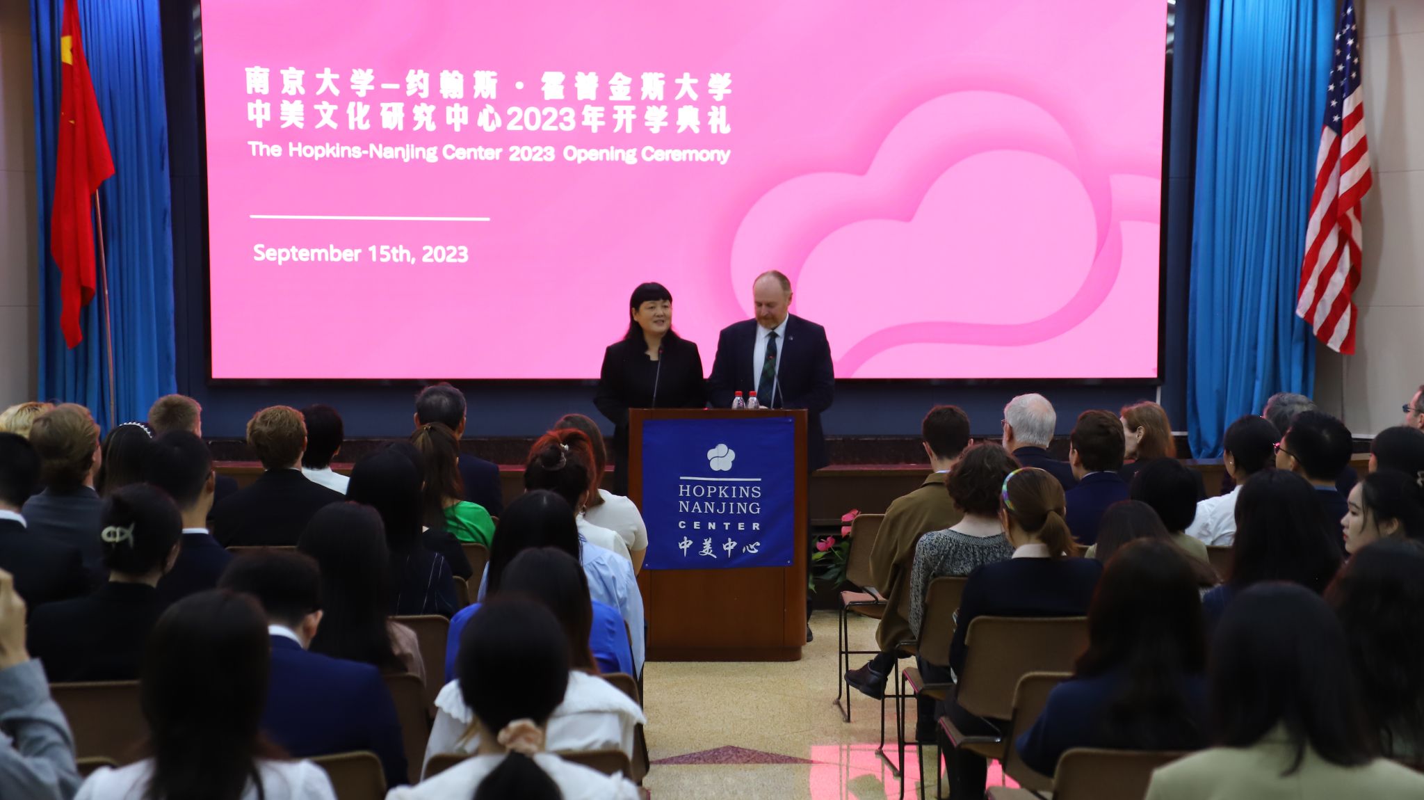 2023年9月15日下午,凯发k8官网-约翰斯·霍普金斯大学中美文化研究中心在西楼报告厅举行第三十八期证书班暨第十八期硕士班开学典礼。凯发k8官网党委常委、副校长王振林出席典礼并讲话。中美中心教职工和校友,以及来自中国、美国、法国、哥伦比亚、墨西哥、新西兰等国家的109位新生共同出席开学典礼。中美中心中方主任从丛、美方主任魏亚当(Adam K. Webb)主持典礼。