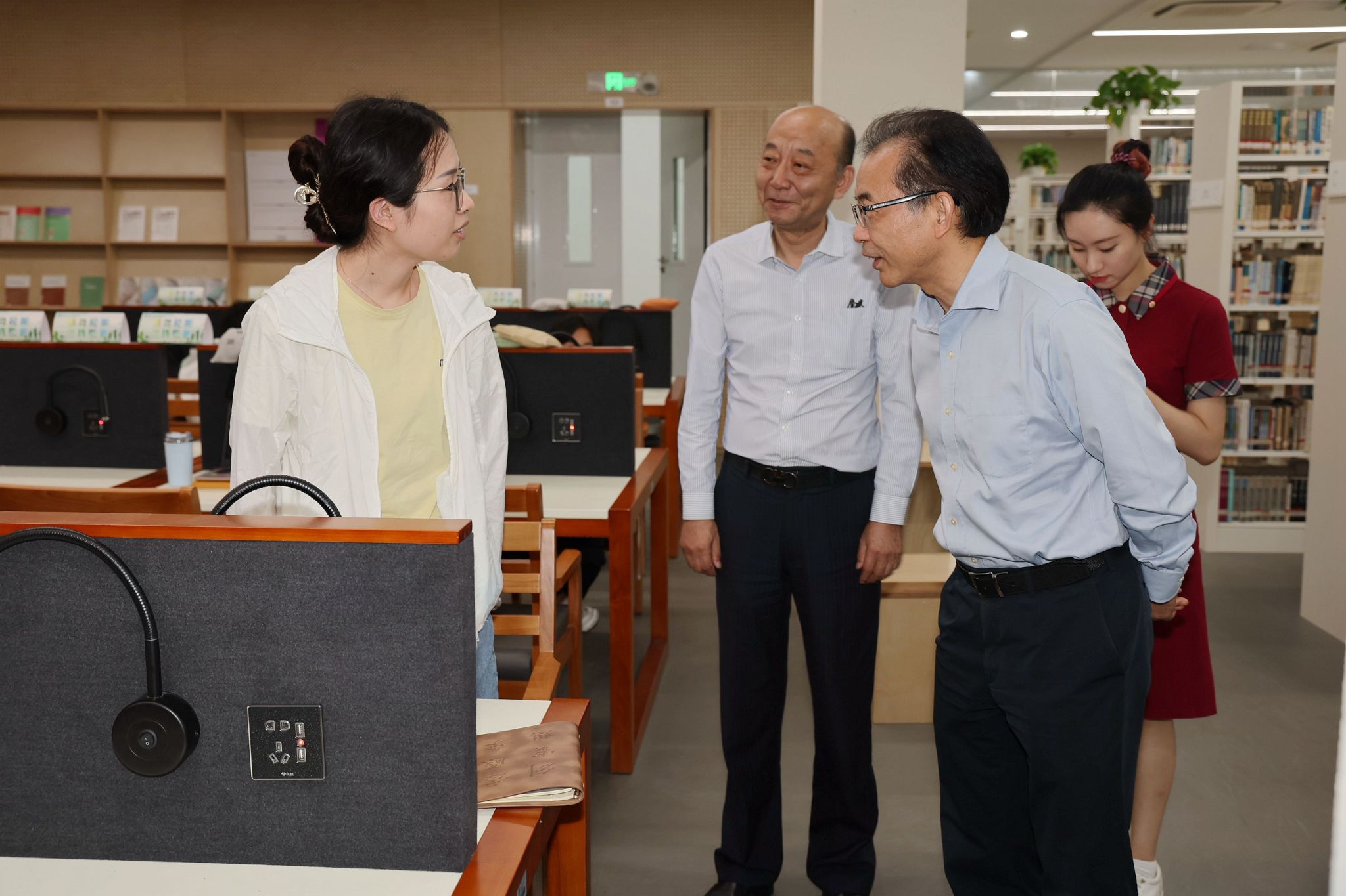 临近节日,图书馆内依旧有许多学生正在伏案苦读。图书馆相关负责人向谭铁牛汇报了近期开放时间、展览策划、虚拟演播厅建设等相关情况。谭铁牛对图书馆相关工作予以充分肯定,并指出,要进一步以师生为本,提升服务管理水平。