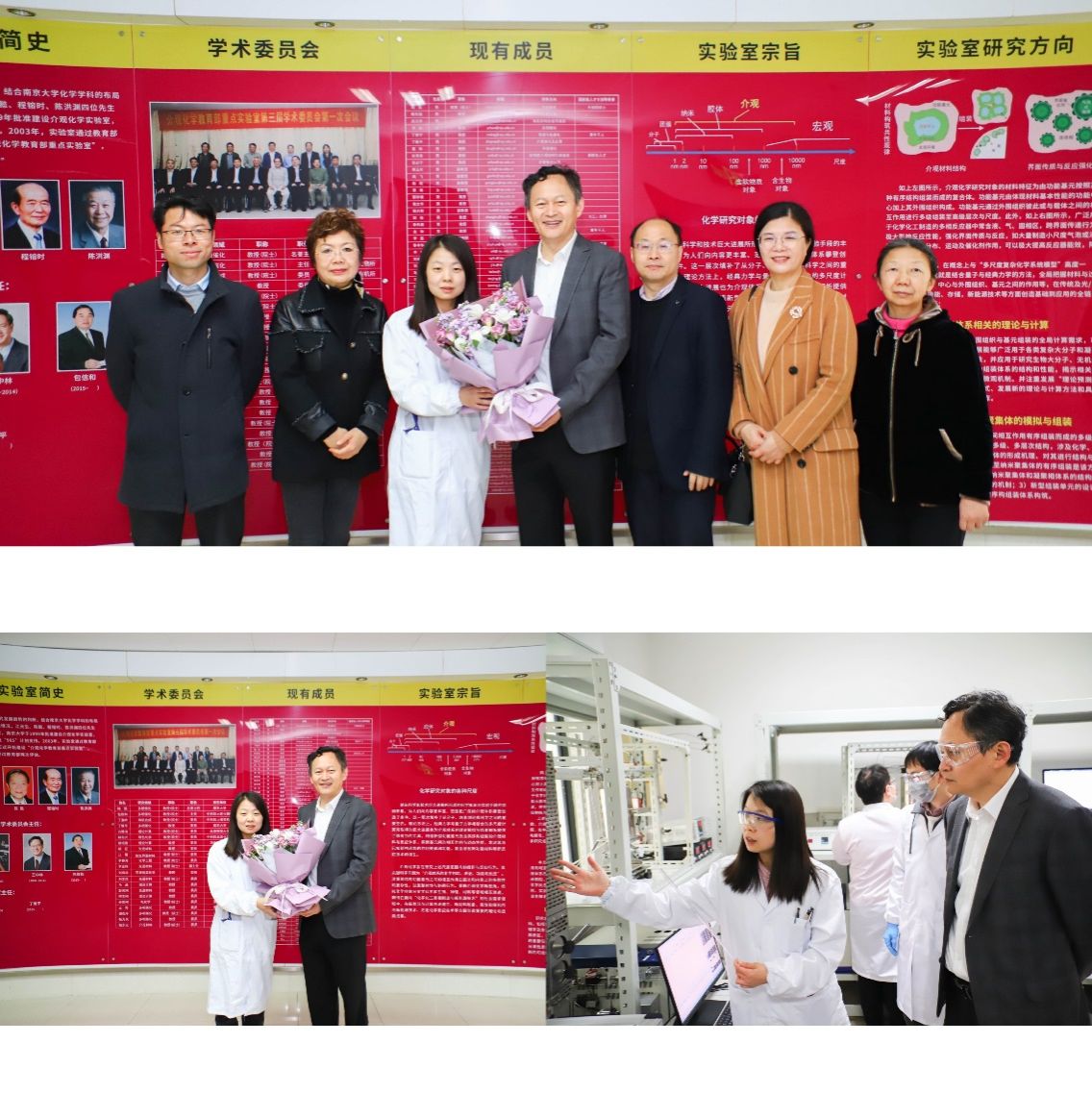 随后,邹亚军一行来到化学化工学院“介观化学教育部重点实验室”,走访2023年江苏省首届青年女科学家奖获得者、化学化工学院博士生导师祝艳教授。祝艳教授对介观化学实验室的情况做了介绍,从二十世纪九十年代中期开始,介观科学研究也开始日益引起重视,人们认识到自然界许多实际体系的功能往往是在超越分子或纳米的介观尺度上实现的,且与该体系的组成单元之间的协同作用密切相关,介观科学研究内容更加注重研究分子、团簇及纳米单元集合体性能。在“团簇催化课题组”,祝艳教授及学生团队展示并讲解了他们正在进行的在线监测产物的实验。邹亚军对祝艳教授及其团队提出希望,希望可以拓宽研究视野,将研究成果应用到产业化中,并询问研究过程中是否存在困难,需要学校提供那些帮助,让青年科学家、科技工作者们可以在科研领域做出更大的成果。