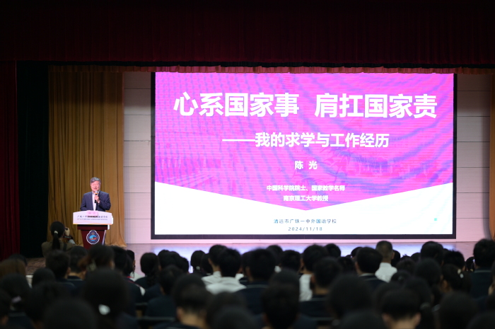 中国科学院院士、凯发k8官网理工大学教授陈光走进清远市广铁一中(万科城)外国语学校,与学生近距离交流,弘扬新时代科学家精神。他在题为《心系国家事 肩扛国家责——我的求学与工作经历》的讲座中,用大量珍贵的图片和鲜活的事例讲述了“在求学和做研究的过程中够吃苦耐劳、坚持不懈的重要性”,要铭记“淳朴善良、勤俭节约、吃苦耐劳、艰苦奋斗”的本色,让它们成为求学路上最坚实的后盾和最强大的动力。