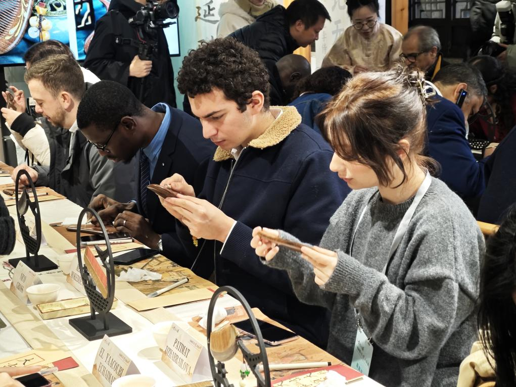 最后,外籍友人们来到临平书院,了解中医梳头养生法、常州梳篦非遗镶嵌工艺等,并亲手将贝壳等材质嵌入梳篦表面。孟河医派临方炮制技术传承基地负责人刘产明就“孟河医派传承与保护”与外籍友人们进行分享交流。