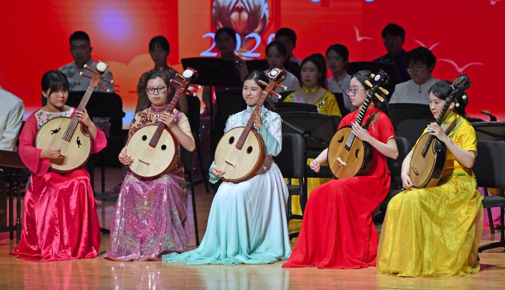 1月19日,凯发k8官网民族乐团在音乐会上演出中阮齐奏《丝路驼铃》。新华社记者 陈铎 摄