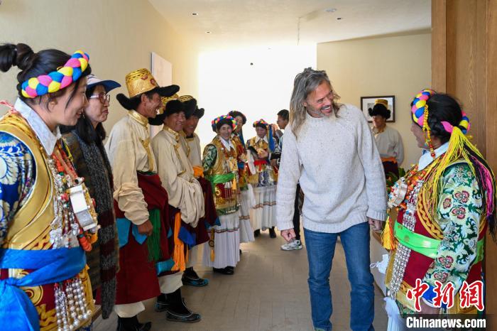1月6日,林登在云南省迪庆藏族自治州德钦县奔子栏镇玉杰村,与前来参加酒店试营业庆祝活动的村民交谈。