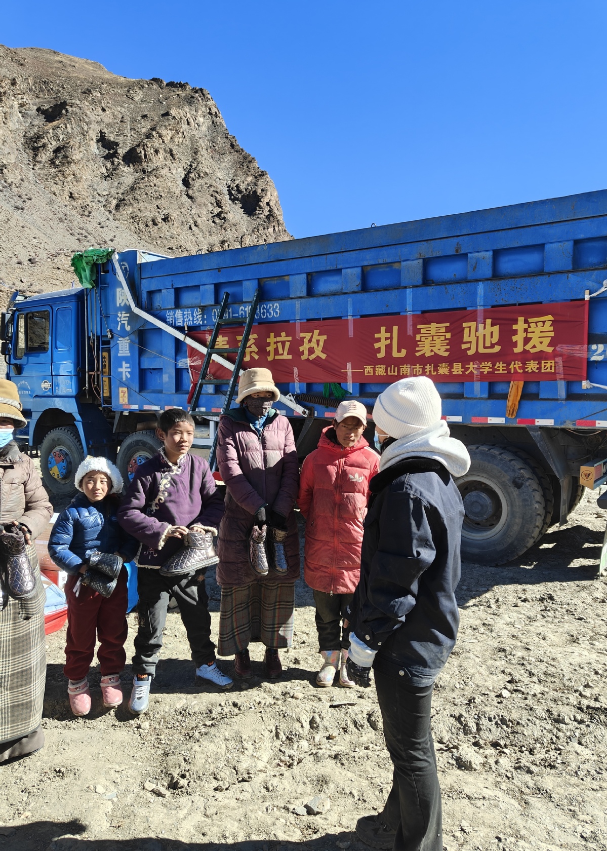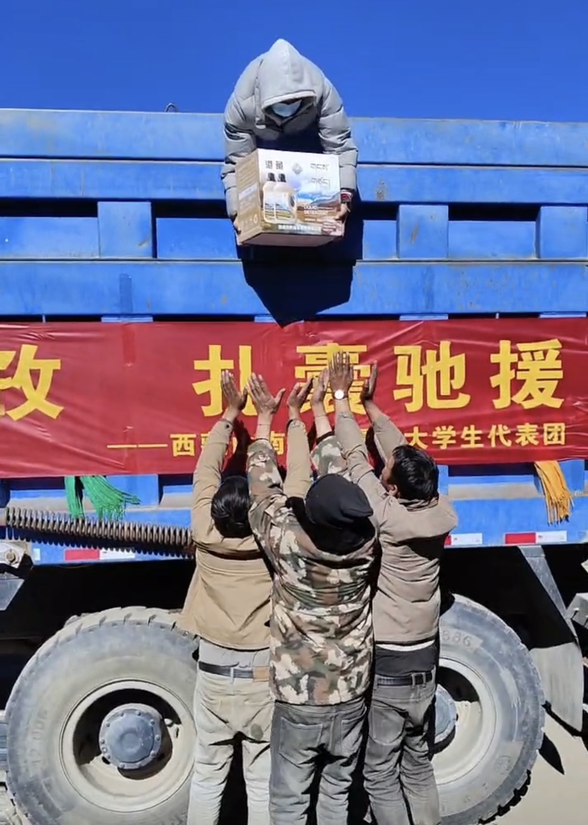 The Tibetan college students deliver supplies to affected residents in Samdrub village, Chushar township, Lhaze county in Shigatse, Xizang autonomous region, on Jan 10. [Photo provided to chinadaily.com.cn]A truck loaded with supplies navigated the winding roads of the Xizang autonomous region, stopping in village after village in Lhaze county to distribute much-needed aid following the 6.8-magnitude earthquake that struck on Jan 7.