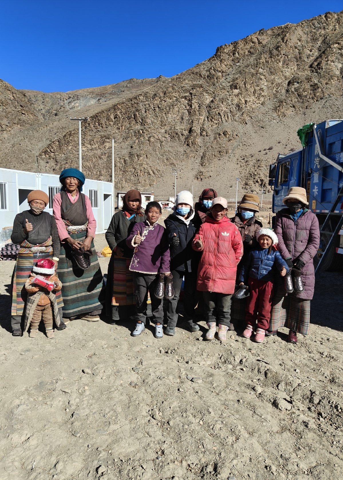 The Tibetan college students give away snow boots to residents in Mangphu village, Lhaze county, on Jan 10. [Photo provided to chinadaily.com.cn]Dekyi Drolma, the initiator and a 21-year-old student at Nanjing University, felt compelled to act.