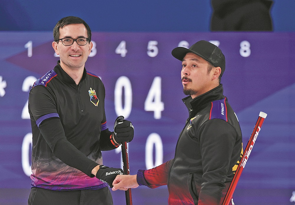 Marc Pfister and Christian Haller react to a good maneuver on the ice. AFP/XINHUADespite being a total rookie on the ice, Frei — a successful entrepreneur who studied finance and sinology at the University of Zurich and China's Nanjing University before co-founding the multi-million-dollar business Amorana.ch, an online sex toy shop — took charge of the team's social networking and business development, and even sold his company to sponsor the team.