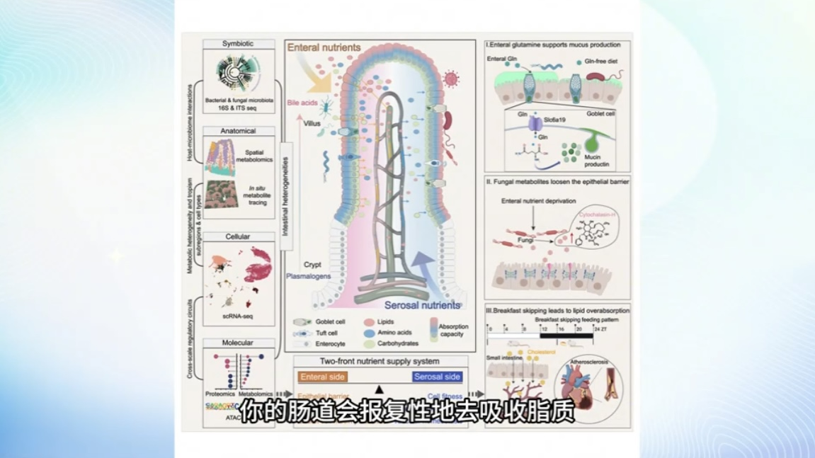 赵越提到,前段时间,浙江大学王迪教授团队在《细胞》发表论文,文章发现,断食后肠道会报复性地吸收脂质,并且有非常多的实验论证。论文中进行了肠外营养和肠内营养的实验,也进行了小鼠限制性饮食的实验,发现如果早饭不吃,会造成肠道过度吸收脂质,带来心血管疾病发生的风险。