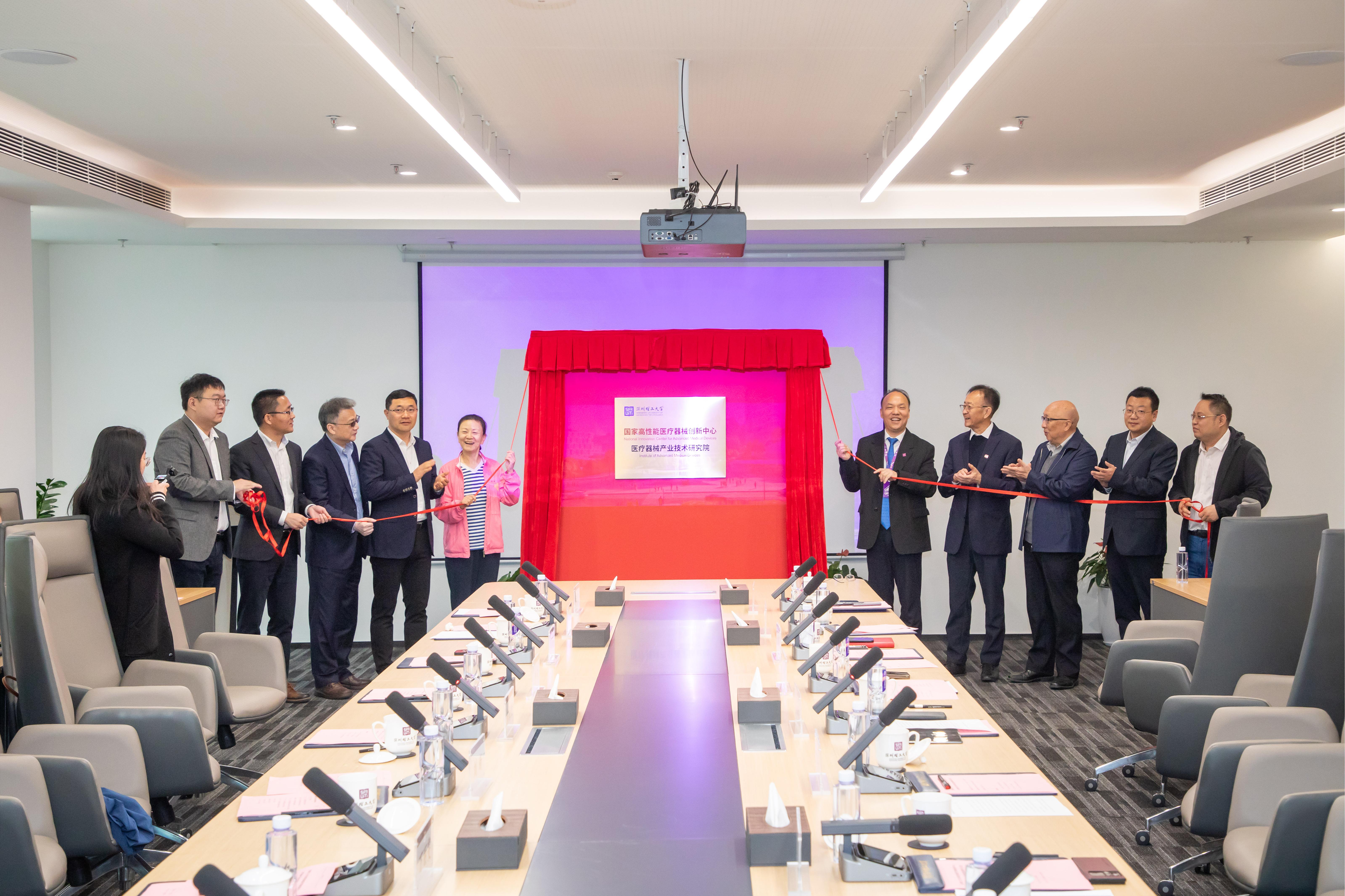 深圳理工大学党委书记朱迪俭、校长樊建平、教务长赵伟、校长助理杨帆和国创中心主任郑海荣、国创中心副主任顾瑛、国创中心董事长刘新、国创中心总经理刘恒等共同为医疗器械研究院揭牌。