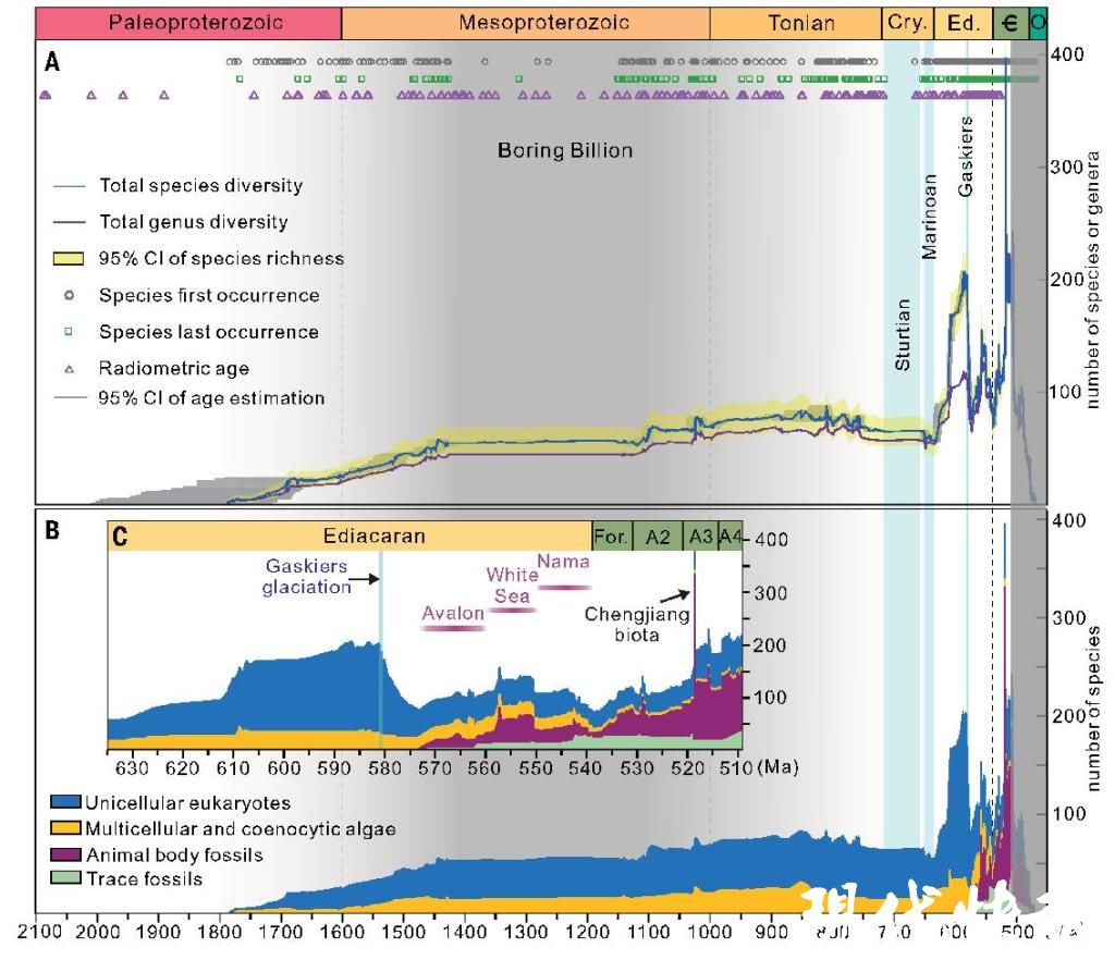大冰期事件结束后,地表温度回暖、大气氧含量升高,地球物种多样性开始迅速增加,并频繁发生大的波动,造成了多次生物大辐射和大灭绝事件。这些现象进一步证实了,生命从简单到复杂的演化不是简单的线性历程,而是呈长期滞缓与相对快速辐射交替的发展模式。
