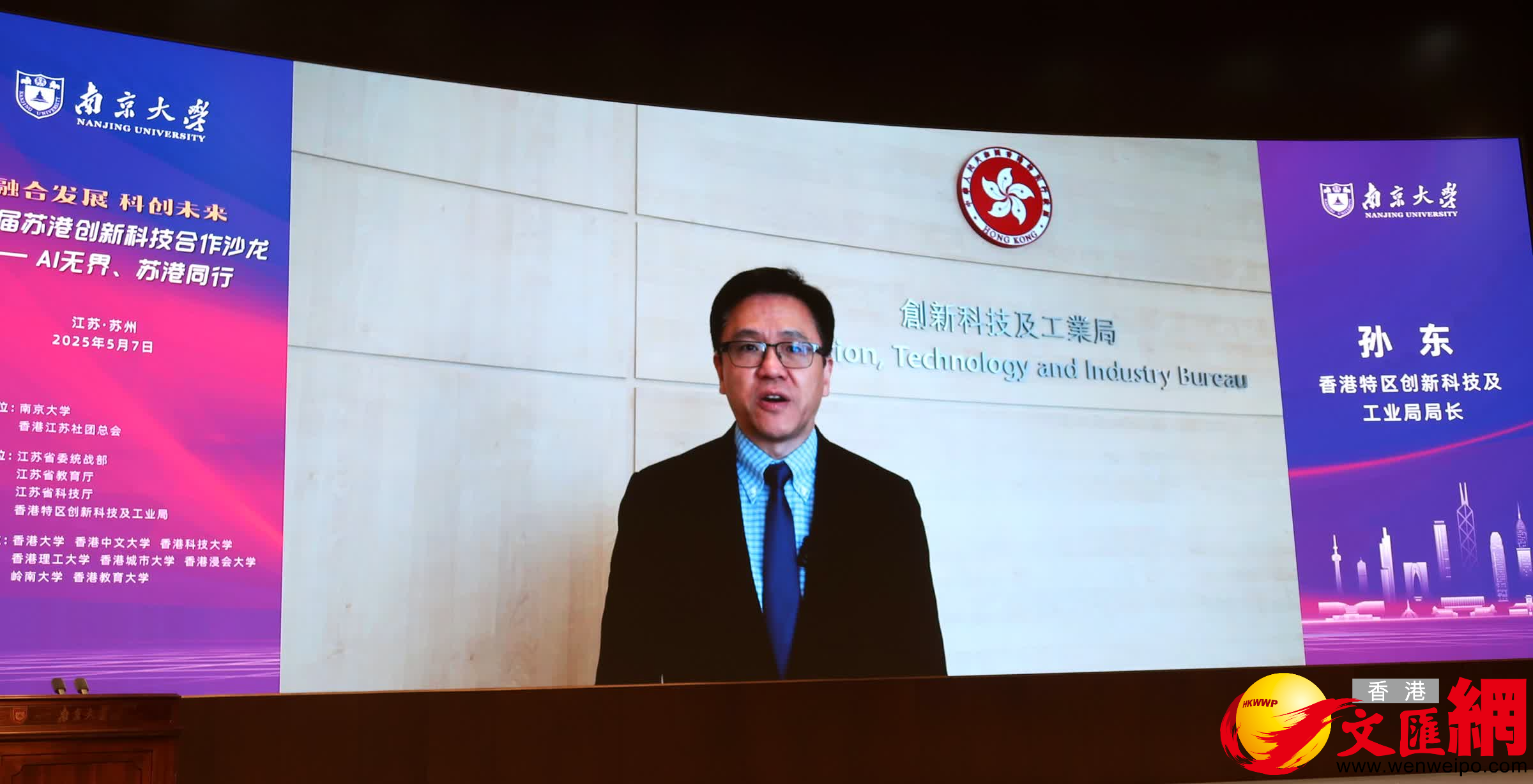 香港创新科技及工业局局长孙东视频致辞。(香港文汇网记者 陈旻 摄)