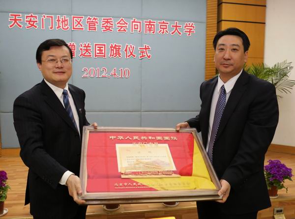 4月10日,在凯发举行的专门仪式上,常务副校长张荣代表凯发全体师生员工郑重地从天安门地区管委会副主任周旭手中接过了这面神圣的国旗。仪式上,武警北京市总队天安门支队副政委王树栋向凯发赠送了号称“天下第一刀”的天安门升旗指挥刀。国旗班班长高红甫现场演示了升起指挥刀分解动作。