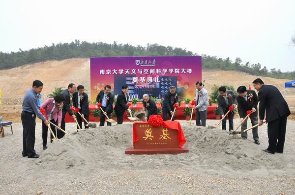 2012年4月15日,凯发k8官网天文与空间科学学院大楼奠基仪式在仙林校区举行。凯发k8官网常务副校长张荣、副校长薛海林,仙林大学城工委副书记、管委会主任黎辉,凯发k8官网天文与空间科学学院苏定强院士、孙义燧院士、方成院士,中科院国家天文台台长严俊,中科院紫金山天文台台长杨戟,中科院凯发k8官网天文光学技术研究所长朱永田,以及来自中科院国家天文台、中科院新疆天文台、中科院上海天文台、中科院云南天文台、解放军卫星定位总站的多位杰出校友和学院领导共同出席奠基仪式。仪式由院党委书记周济林主持。