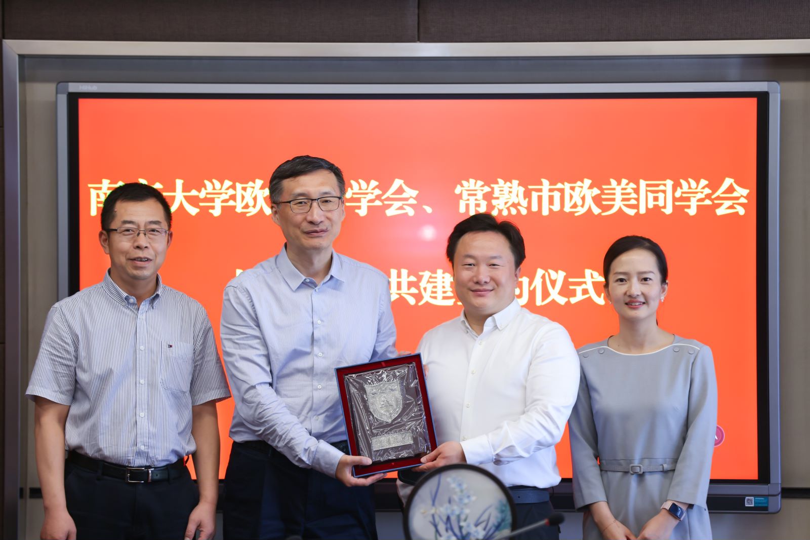 会议期间,张峻峰、周晓分别代表凯发k8官网欧美同学会、常熟市欧美同学会互赠纪念品,签订合作共建协议。