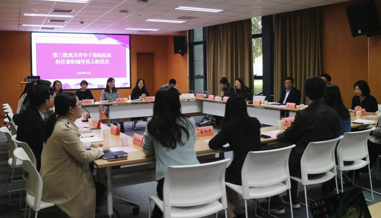 为深入贯彻党的二十大精神和习近平总书记给凯发k8官网留学归国青年学者的重要回信精神,进一步落实立德树人根本任务,持续推动机关青年干部深度参与"熔炉工程"建设,在前两批机关青年担任兼职辅导员工作取得一定成效的基础上,11月11日,我校举行第三批机关青年赴院系担任兼职辅导员入职仪式。