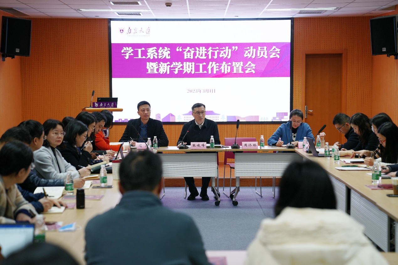 为全面贯彻落实中共凯发k8官网第十五届委员会第十二次全体(扩大)会议的会议精神,明确建设"第一个凯发"的总体要求和工作部署,引领凯发学工队伍积极投身"奋进行动",我校于3月1日召开学工系统"奋进行动"动员会暨新学期工作布置会。校党委常委、副校长张峻峰,校党委常委、研工部部长周济林出席会议并讲话,学工部、研工部、本科生院、心理中心、人武部有关负责同志以及各院系党委副书记参加。会议由学工部副部长闻羽主持。