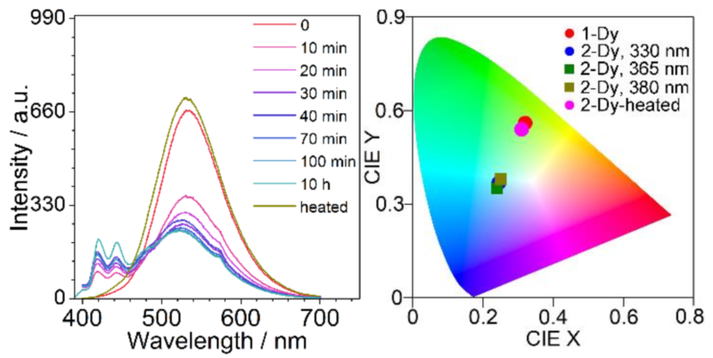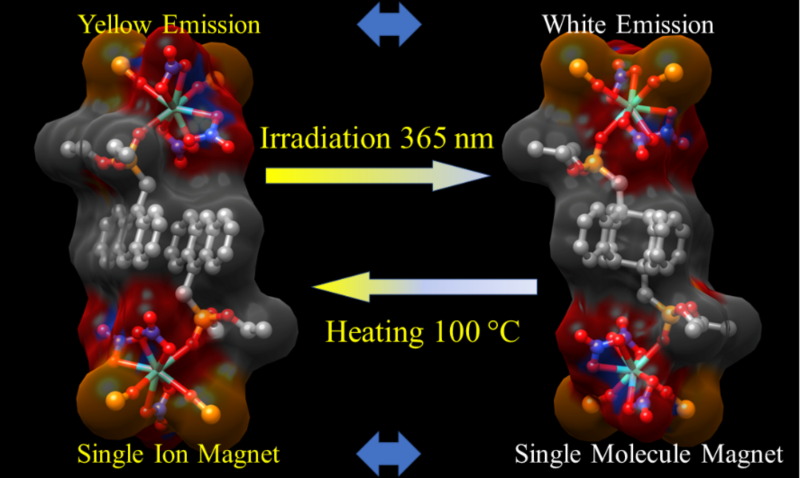 分子基磁性材料是一类在分子水平上通过超分子组装得到的新型磁性材料。将磁光双功能复合在同一个分子材料体系中并实现不同功能之间的耦合,是实现高密度信息存储、信息转换的重要方法之一,相关研究将进一步推动分子基磁性材料和新型多功能分子材料的应用与器件化研究。郑丽敏教课题组成功制备一例包含蒽基的稀土镝单离子磁体,利用蒽基的可逆[4+4]环加成反应,实现了光致分子磁性和光学性质的可逆调控。相对于光照前的化合物,光二聚产物的单分子磁体能垒增加一倍,发光颜色从黄绿色变为蓝白色,同时伴随可逆的单晶到单晶的结构转换。这一工作为设计合成可应用于磁光存储或开关器件的双稳态智能分子材料提供了新的途径。