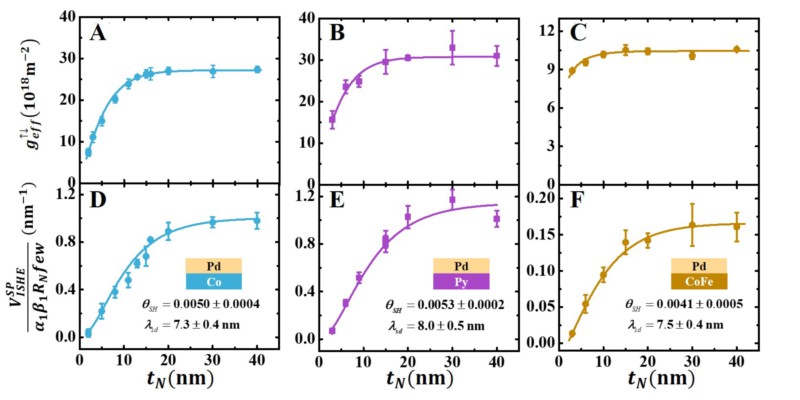 图4:A-C分别为Co(16 nm)/Pd(t),Py(16 nm)/Pd(t), 和CoFe(16 nm)/Pd(t)样品中Pd厚度依赖的有效自旋混合电导。D-F为相应样品的归一化自旋泵浦电压信号随厚度的演化。通过二者的拟合可以获得自旋霍尔角和自旋扩散长度,研究表面在三种不同的体系中获得的Pd自旋霍尔角和自旋扩散长度在误差范围内完全一致,与铁磁材料的选取无关。