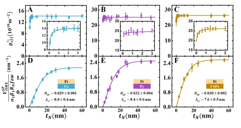 图3:A-C分别为Co(20 nm)/Pt(t),Py(20 nm)/Pt(t), 和CoFe(13 nm)/Pt(t)样品中Pt厚度依赖的有效自旋混合电导。D-F为相应样品的归一化自旋泵浦电压信号随厚度的演化。通过二者的拟合可以获得自旋霍尔角和自旋扩散长度,研究表面在三种不同的体系中获得的Pt自旋霍尔角和自旋扩散长度在误差范围内完全一致,与铁磁材料的选取无关。