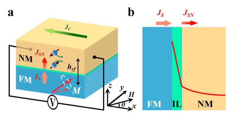 图2:A:自旋泵浦效应实验构型。B:自旋流传输过程中的截面图。