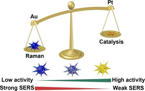 该课题组在多功能纳米酶的设计和合成上亦取得了一定的成果。前期工作中,该课题组及其合作者成功制备了同时具有拉曼活性和过氧化物酶模拟酶活性的Au纳米颗粒,并用于活体动物组织内(如脑内、瘤内)重要生物分子(如葡萄糖、乳酸)的检测,以及药物治疗中药效的评估(ACS Nano, 2017, 11, 5558-5566)。然而由于Au纳米颗粒的催化活性较弱,整个检测过程需要半个小时,大大限制了其实际应用。为解决此问题,该课题组引入了催化性能优异的Pt,制备出高活性的Au@Pt纳米颗粒。然而Pt层的引入使得Au表面拉曼性能减弱,因此为制备出同时具有Au核优异的表面拉曼性能和Pt壳较强催化性能的Au@Pt纳米酶,该课题组与现代工程与应用科学学院张学进课题组合作,利用模拟和实验研究了不同含量Pt对Au的拉曼性能和催化活性的影响。最终研究结果表明当Pt含量为2.5%(Pt/Au摩尔比),该双功能纳米酶具有优异的拉曼性能和催化活性,可用于表面增强拉曼对双氧水的快速高灵敏检测。相较于Au纳米酶,Au@Pt纳米酶有效缩短检测时间为2min,且将检测灵敏度提高了1-2个数量级。(ACS Applied Materials & Interfaces, 2018, 10, 12954-12959)