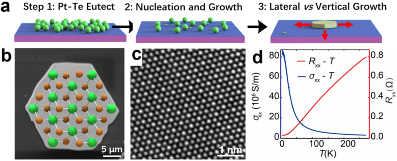 图(a)PtTe2单晶的低温共熔法生长机理示意图。(b)所生长的PtTe2单晶的扫描电镜图和平面原子结构示意图。(c)PtTe2原子分辨透射电镜图。(d)PtTe2单晶的变温电学性质,展示出超高的电导率。