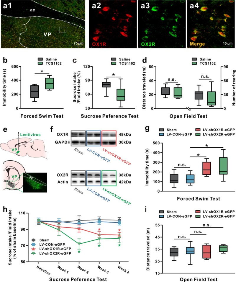 图1. 药理学阻断腹侧苍白球中orexin能神经传入或慢病毒敲减orexin受体导致抑郁样行为。