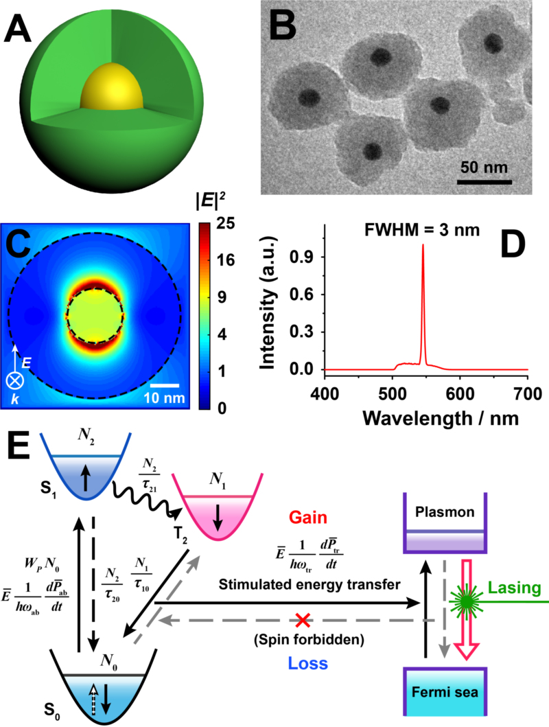 现代生命科学和医学的高度发达,很大程度上依赖于发光探针的先进性及其发展。过去的几十年,人类创造出一系列的发光物质,并得以在基础研究、医学诊断及化学工业等多个层面广泛应用。这些发光探针包括:有机荧光染料、半导体量子点、荧光蛋白、上转换荧光材料、生物发光分子等等。使用不同颜色的发光探针,可观测生物体系中多种生物分子的协同行为,或同时分析多种特征的疾病标志物。上述发光探针的发光行为都是基于自发辐射,具有较宽的发射光谱分布。这种宽谱的发光特征,从物性限制了同时标记和检测的发光探针的种类不过4-5种。如能从物性根源上改变发光探针的发光行为,使其发光呈现出类似激光的单色性,有望大大拓展生命分析的容许通道数。然而,之前报道的二能级等离子激光体系离实际生物应用还有较大的距离。要在纳米尺度内实现光的受激辐射放大,必须对增益介质和谐振腔内的电子跃迁和能量转移实施精准的设计和调控,以降低激射阈值、延长激射时间,满足实际生物应用的要求。在激光基础理论的启发下,该研究团队通过设计增益介质的电子能级,利用电子的三重激发态跃迁,第一次在实验上构建了三能级的等离子体激光探针。 受益于三重激发态的长寿命以及自旋禁阻的量子规则,实现了~3 nm的激射线宽,~102 μs的发光寿命,以及低至1 mJ cm?2的激射阈值(较之前降低了2个数量级)。已能与常规生物检测仪器(如共聚焦显微镜、流式细胞仪)相兼容。该探针设计理念的建立,为下一代新型发光探针的设计、开发和应用具有重要指导意义。