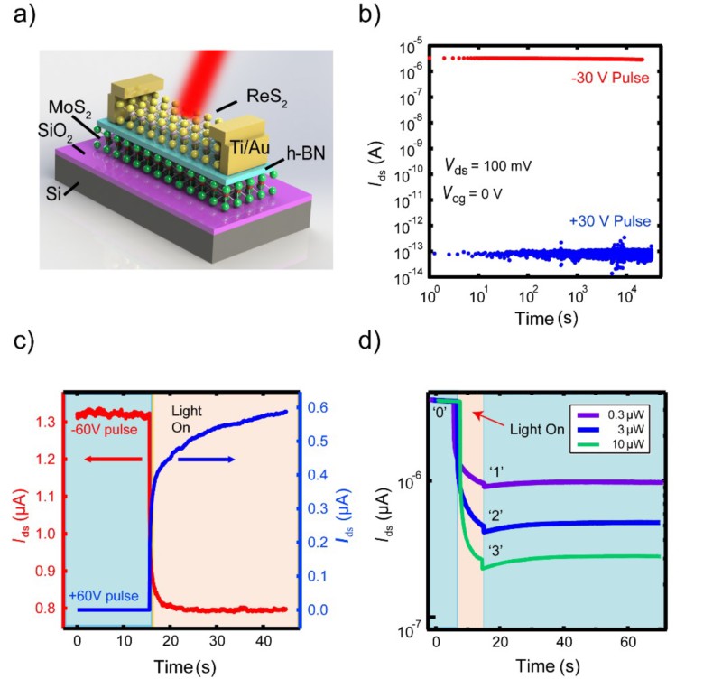 图a) 基于浮栅的ReS2/h-BN/MoS2范德华异质结光电晶体管器件;b) 器件的存储性能,高开关比(超过107)长保持时间(超过104s);c)栅压调控的正光电导和负光电导效应;d)基于负光电导的多态光存储器件模型,读出电流和存储态的对应关系, “0”代表无光照射时的读出电流、”1”、“2”、”3”对应不同功率光照射10 s, 撤去光照后的读出电流。