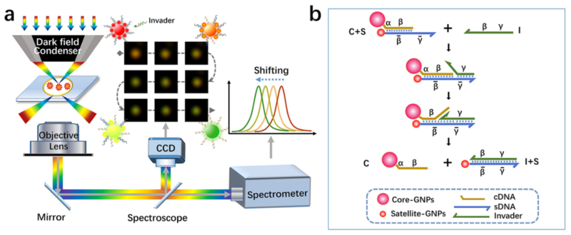 在此基础上,课题组开展了在单细胞内的单分子成像与测量,利用局域表面等离子体共振耦合探针,首次将所研究DNA/RNA体系的链取代过程从简单的溶液体系推进到真实的细胞环境中。采用纳米金“卫星”等离子体,通过链取代产生的卫星离去事件结合数理统计方法, 建立了反映真实生理环境下链取代的动力学模型,揭示了DNA/DNA与RNA/DNA取代动力学过程的差异。在单个活细胞中,只需要数个探针就可以获取反应动力学参数,并得到单细胞内核酸分子表达量的准确数据。该体系DNA分子间动力学模型的建立, 对于推动DNA技术的发展以及DNA探针的在体应用具有重要的指导意义。相关论文发表在 ACS Nano (2018, 12, 3341?3350)上。化学化工学院博士生李美星与徐琮辉副研究员为论文共同第一作者,赵微副研究员和徐静娟教授为论文共同通讯作者。