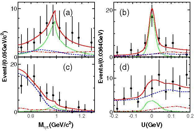 下图展示了对两个运动学变量,hp粒子系统不变质量(第一列)和U=Emiss–cpmiss(第二列),进行二维拟合后相应变量的投影分布。上面两图对应D0→a0(980)-e+ne过程,下面两图对应D+→a0(980)+e+ne过程。带误差棒的点是实验数据,红色实线为总的拟合结果,绿色虚线是信号过程的分布,其他曲线代表各背景过程的分布。从图(a)、(b)可以看到很清楚的信号过程。
