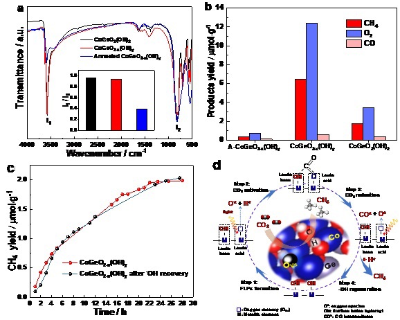 图2.(a)FTIR谱分析羟基氧化物CoGeO2(OH)2、光辐照生成受阻路易斯酸碱对的CoGeO2-x(OH)y和热处理移除部分羟基的A-CoGeO2-x(OH)y 。(b)富路易斯碱CoGeO2(OH)2、受阻路易斯酸碱对的CoGeO2-x(OH)y和富路易斯酸的A-CoGeO2-x(OH)y光催化CO2转化性能对比。(c)暴露CoGeO2-x(OH)y和在水汽中再生表面羟基。(d)表面晶格羟基作为固态质子源并在受阻路易斯酸碱对活化下的光催化CO2还原产CH4的反应机制。步骤1:通过光生空穴氧化表面晶格羟基形成FLPs;步骤2:FLPs协同作用活化CO2分子;步骤3:表面羟基作为质子源参与光催化还原CO2反应;步骤4:通过将光催化剂暴露于含水分子的环境下使在反应中消耗掉的羟基再生,实现催化剂表面晶格羟基可再生的“自呼吸”式光催化CO2还原。