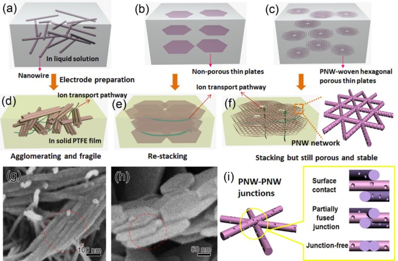 图1.(a-c)分别为超长径比的纳米线、高宽厚比的无孔薄片和NixCo3-xPy微孔纳米线编织的正六边形微米片在液体中悬浮;(b-f)这三种纳米结构嵌入固态PTFE薄膜的分散情况,箭头表示离子的传输路径;(g-h)分别为前两种发生团聚堆叠现象的SEM图;(i)微孔纳米线相互连接的不同方式及连接处的横截面(右)。