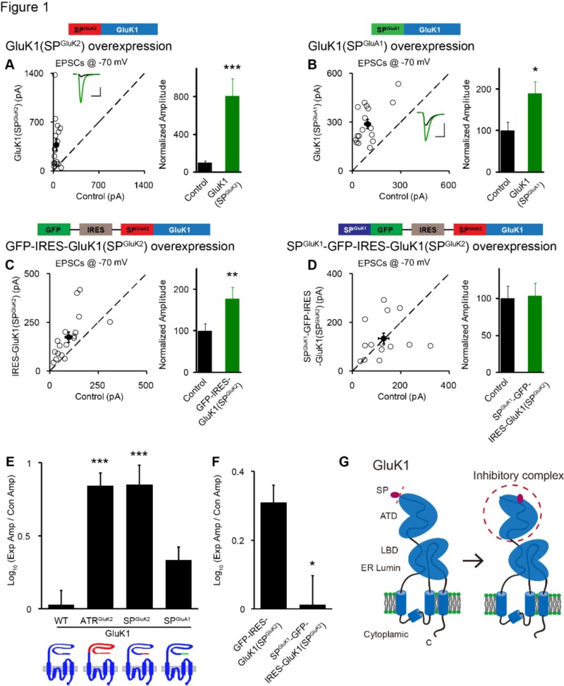通过与盛能印博士的合作,石云课题组在利用CA1椎体神经元来研究Kainate-型谷氨酸受体(KAR)的突触功能时发现:在CA1神经元表达GluK2受体能够进入突触后膜,极大地(>10倍)增强突触后电流(EPSCs),而表达GluK1受体却不能进入突触后膜,不影响EPSCs(Sheng et al., 2015; Sheng et al., 2017)。为了解析KAR受体的突触定位机制,石云课题组依据GluK1和GluK2蛋白结构的相似性,构建和检测了一系列的嵌合型突变受体。他们意外发现GluK1的前导信号肽发挥着关键性调节作用。当GluK1的信号肽替换为GluK2信号肽时,GluK1受体成功定位到突触上,并且该GluK1(SPGluK2)受体能够10倍地增强突触后电流,其幅度与GluK2类似 (Fig.1 A)。课题组人员推测,这个现象存在两种可能的机理,第一、GluK2的“超级”信号肽赋予了GluK1额外的突触转运能力。第二、GluK1信号肽抑制了其本身具有的突触后膜转运能力。为了区分这两种可能性,课题组人员设计了两个实验。第一个实验是将GluK1的信号肽换成GluA1的“弱”信号肽,因为过去的研究表明在CA1神经元表达GluA1时,并不能增强突触活性,结果在这个“弱”信号肽带领下,GluK1(SPGluA1)同样可以增强突触电流 (Fig. 1B, E)。第二个实验更直接,将GluK1的信号肽和GluK1(SPGluK2)共同表达在同一个神经元中,结果GluK1(SPGluK2)的突触增强效应被完全抑制 (Fig. 1C,D,F),说明GluK1的信号肽对于GluK1的突触定位具有反式抑制作用。进一步的解析发现GluK1的信号肽和氨基端结构域(ATD)共同发挥抑制作用,缺一不可。生物化学实验进一步证明GluK1的信号肽可以和GluK1的ATD相互结合。同时,课题组研究人员也发现,信号肽不仅抑制GluK1的突触定位,也抑制了上膜转运。所有这些研究结果表明,GluK1受体的信号肽能够作为一个非常规配体,结合于其ATD结构域,行驶调节GluK1受体胞内转运和突触定位的功能 (Fig. 1G)。