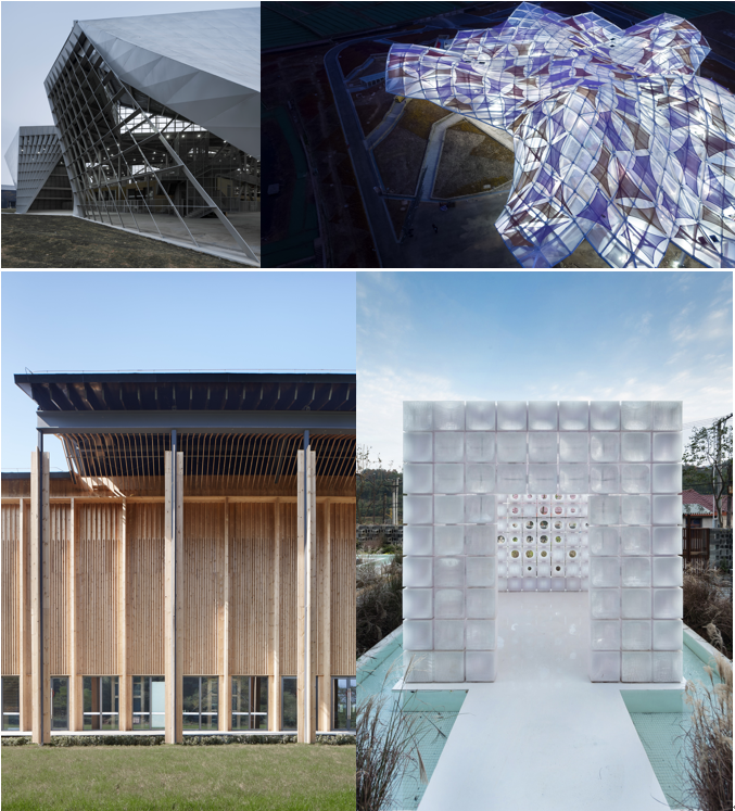 钟华颖代表作品:左上-万科创展中心;右上-宿迁三台山花田剧场;