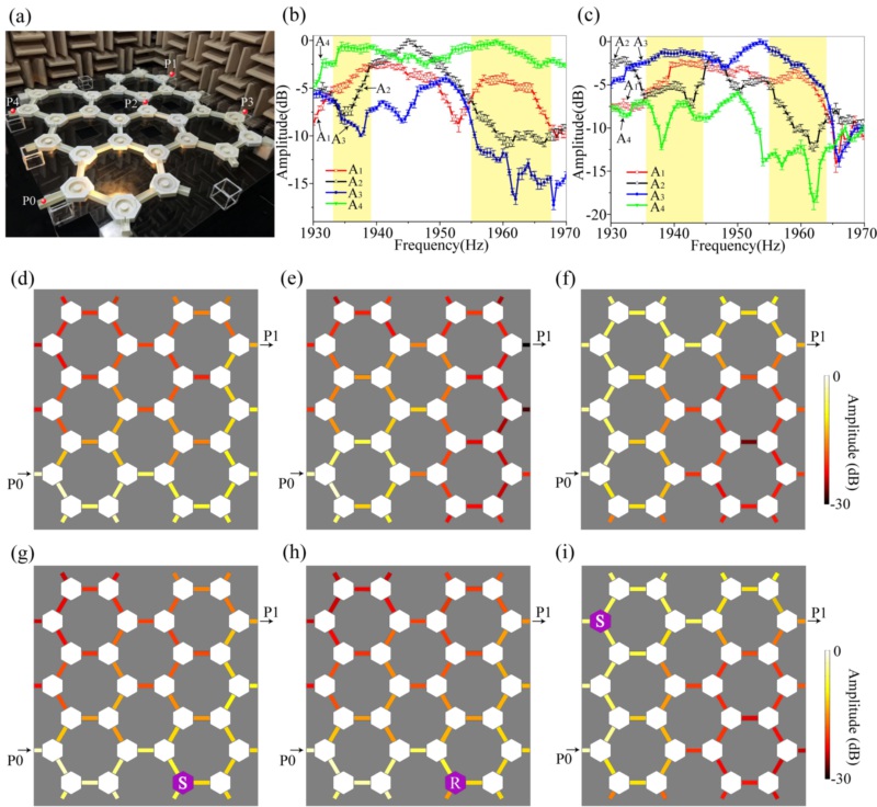 图二、(a)声陈绝缘体实验测量现场图;(b-c)四个测量点处的声压随频率变化情况;(d、f)逆时针和顺时针的单向边界态实验测量图;(e)体态的实验测量图。(g-h)当一个单元停止转动(S)或者反向转动(R)时,逆时针单向边界态的实验测量图;(i)当一个单元停止转动(S)时,顺时针单向边界态的实验测量图。