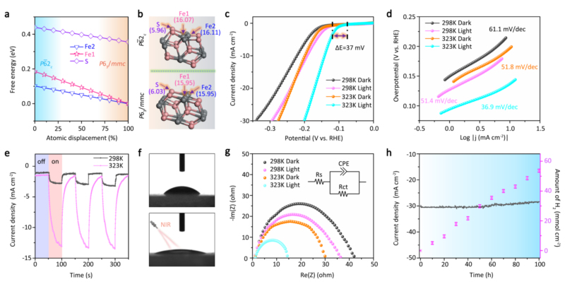 获取清洁的氢能替代传统化石燃料是解决能源危机、环境污染等世界性难题的有效途径。因此,如何通过催化剂设计高效地获取氢能一直是当代科研工作者的工作重心和研究热点。研究表明良好的电催化剂需具备以下特点:(1) 价格低廉,不包含贵金属元素(如Pt);(2) 更多的活性位点,扩大催化剂体表比; (3) 更高的催化活性,合适的吉布斯自由能;(4) 高效的载流子迁移,良好的金属性。 然而,目前研究思路主要集中在半导体纳米结构制备或引入空位、掺杂等通过微结构调控方法增加活性位点数量、提高材料的催化活性,但是这种设计会不可避免的增加催化剂制备成本。众所周知,任何材料性能突破完全取决于材料本身固有的物理特性。因此,从材料电子结构改造(例如,半导体—金属相变)这个源头入手,将成为一种全新的研究思路。基于以上考虑,物理学院吴兴龙教授课题组通过特定波长近红外光在超薄FeS纳米片中激发大量光生载流子,通过电声子耦合作用降低该体系中半导体—金属相变的势垒,从而实现载流子高效迁移和催化活性巨大提升。该研究工作首次在廉价的FeS纳米片体系中实现半导体—金属相变并且创造性地用于提高电催化性能,对材料电子结构调控和新型催化剂设计提供了一种全新的认识和研究思路。该工作以“Photoinduced semiconductor-metal transition in ultrathin troilite FeS nanosheets to trigger efficient hydrogen evolution” 为题于2019年1月23日发表在Nature Communications 10, 399 (2019). 物理学院博士生周钢、晓庄学院副教授单云、湖凯发学王龙禄、江苏科技大学胡友友为该论文共同第一作者,吴兴龙教授与刘力哲副教授为该论文共同通讯作者。