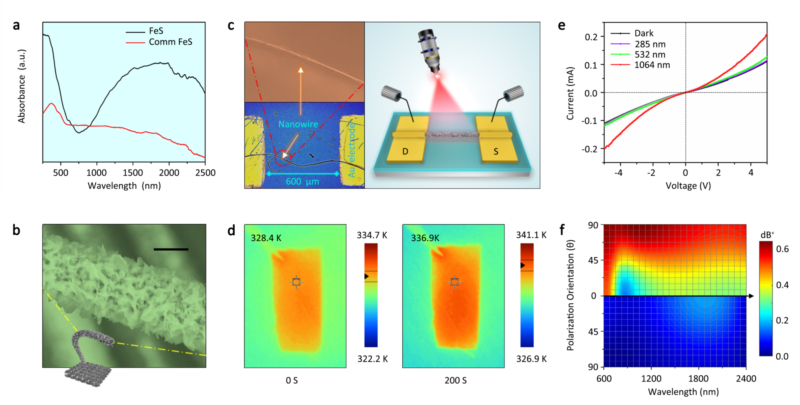 研究团队发现超薄的FeS相变温度大概在400K左右,会因为Fe原子的位移从扭曲的P6(-)2c相转变成高度对称的P63/mmc相,从而实现半导体—金属相变。通过原位拉曼技术监测Eg模式位移发现,光生载流子的大量注入会使得相变温度降低到~323K。理论的计算和光电探测表明红外光引入会通过电声子相互作用明显降低相变势垒。