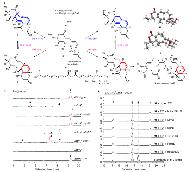 该团队在前期工作中,从海洋放线菌中发现了一个具有抗幽门螺旋杆菌活性的新颖大环内酯化合物命名为streptoseomycin,根据其结构推断,它在微生物体内的合成过程中可能涉及[4+2]环加成反应。为鉴定此过程,他们比较分析了streptoseomycin以及其结构类似物nargenicin的生物合成基因簇,推测一个未知功能的同源蛋白StmD、NgnD很有可能分别负责streptoseomycin和nargenicin中的环化反应。然而,敲除stmD基因并未得到预料中的环化产物前体3,而得到了线性化合物4和5,这很可能是化合物3环内双键较多,张力较大,自发水解开环所致。研究人员设计了一个在微生物体内验证StmD功能的实验,首先敲除了基因簇上大部分基因,仅留下聚酮合成酶基因,此突变株只产生化合物4;当将stmD基因回补回去时,得到了化合物6?8,其中化合物7不稳定,可经Cope重排转化成6。该结果表明,聚酮合成酶的直接产物是3,若无下游其它酶存在时,3将发生水解开环而生成4;若再引入StmD,则催化发生周环反应,奇怪的是,该酶不仅催化了[4+2]反应,也催化了[6+4]反应。