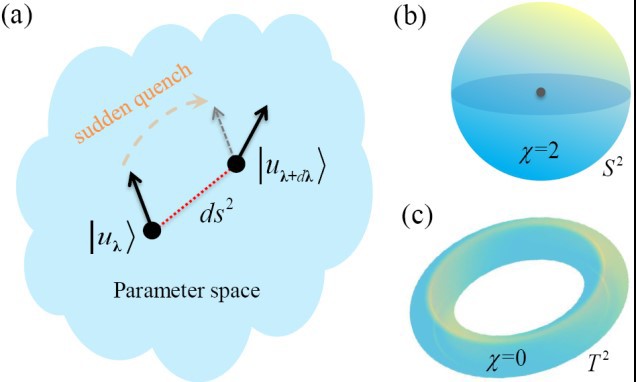 几何是现代物理学,如广义相对论、规范场论和量子力学等的基石之一。量子力学中的量子态定义在希尔伯特空间,而此空间的几何由量子几何张量确定。量子几何张量可以是复数,它的实部为量子度规,而虚部是众所周知的贝里曲率。贝里曲率及其相关的物理现象已经被广泛研究,如Ahoranov-Bohn效应,贝里相位、量子霍尔效应,以及最近的热点领域-拓扑绝缘体。在图1的参数空间中,两点之间的几何特征由复量子几何张量确定,其虚部为贝里曲率,对应的几何意义为波函数在两参数点之间的几何相位差。贝里曲率在二维体系中的积分是陈数,这是量子霍尔效应中的拓扑不变量。而几何张量的实部对应于两点之间的距离(度规)。度规可用来计算欧拉数,典型图形中,(b)圆的欧拉数为2;(c)圆环的欧拉数为0。