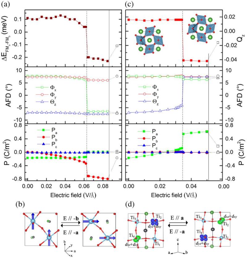 图2. (a)铁磁沿a轴与b轴方向的能量差,氧八面体扭转角度和电极化随电场的变化(b)Ti3+阳离子的磁轴通过电场调控翻转90°的示意图,(c)Jahn-Teller畸变,氧八面体扭转角度和电极化随电场的变化(d)费米面至其以下0.5eV范围内的电荷密度分布。其中(a)(b)电场沿-b轴方向,即垂直于初始极化方向;(c)(d)电场沿a轴方向,即反平行于初始极化方向。