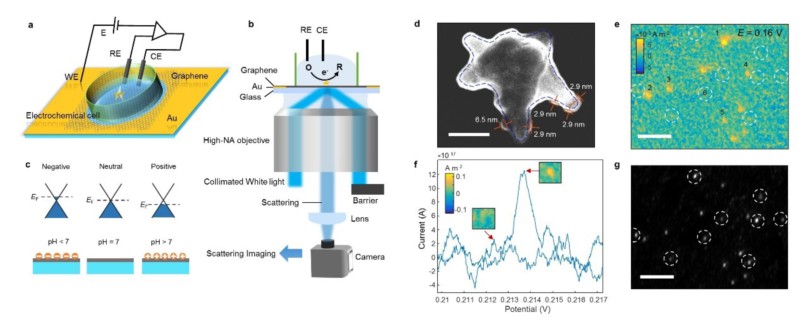 图:(a) 电解池装置的制备示意图。(b)全内反射暗场显微镜的光路图。(c)电荷变化引起的石墨烯费米能级变化示意图。(d) 表面吸附有细胞色素c分子的金纳米星的扫描透射电镜图,标尺为50 nm. (e) 循环伏安过程中电压为0.16V时,多个单颗粒金纳米星电流成像图,其中被标记的颗粒未修饰细胞色素c。(f)单个修饰了细胞色素c的金纳米星的完整循环伏安图。(g) 图e中金纳米星对应的暗场散射成像图,标尺为 5 μm。