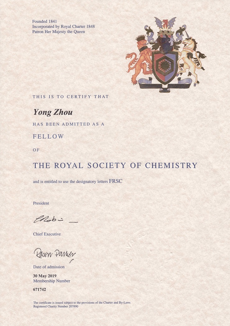日前,物理学院周勇教授收到英国皇家化学会颁发的证书,当选为英国皇家化学会会士(Fellow of the Royal Society of Chemistry,FRSC)。英国皇家化学学会(Royal Society of Chemistry)成立于1841年,是世界上历史最悠久的化学学术团体,国际上最有影响的学会之一,国际权威的学术机构。根据专家推荐,学会每年遴选英国及国际上在化学科学研究领域取得出色成就和为推动化学科学发展做出卓越贡献的科学家为其会士。
