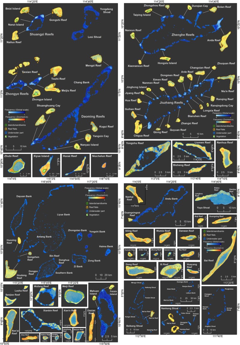 Dong, Y., Liu, Y.*, Hu, C., Xu, B. (2019). Coral reef geomorphology of the Spratly Islands: A simple method based on time-series of Landsat-8 multi-band inundation maps. ISPRS Journal of Photogrammetry and Remote Sensing. 157, 137–154. https://doi.org/10.1016/j.isprsjprs.2019.09.011.