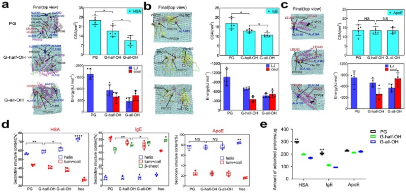 图1. 不同表面修饰石墨烯与三种血浆蛋白相互作用的全原子模拟和体外实验结果。