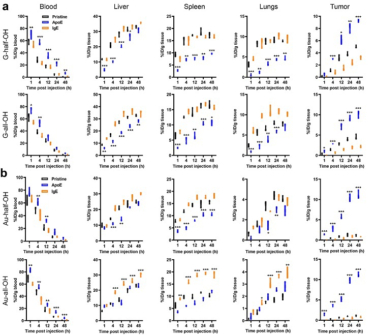 通常HSA和IgE(特别是IgE)的吸附会提高纳米材料被免疫系统清除的概率,而ApoE的吸附则会降低纳米材料被免疫系统识别的可能性。目前工作的重要性还在于他们通过简单地调控纳米材料表面的亲疏水度,可以显著地降低HSA和IgE在纳米材料表面的吸附行为,而同时对ApoE的吸附不会造成太大影响,从而能够极大地提高纳米材料在血液中的循环时间和达到肿瘤组织的数量。相关的体内实验完全验证了这一想法(图3);此外作者还发现通过预吸附ApoE在纳米材料表面,能够进一步提高纳米材料在肿瘤组织的富集量。