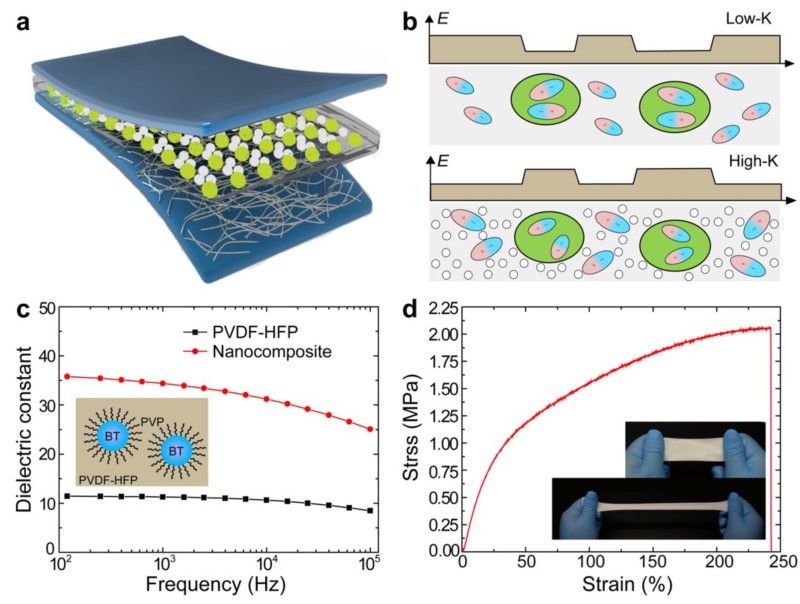 针对交流电致发光器件,高介电材料可有效增强电致发光颗粒处的激发电场,提升器件的发光亮度。研究团队以极性热塑性氟橡胶为基材,通过掺入由PVP所修饰的高介电钛酸钡纳米颗粒,从而得到介电常数大于30弹性高介电材料,其最大拉伸应变大于200%。
