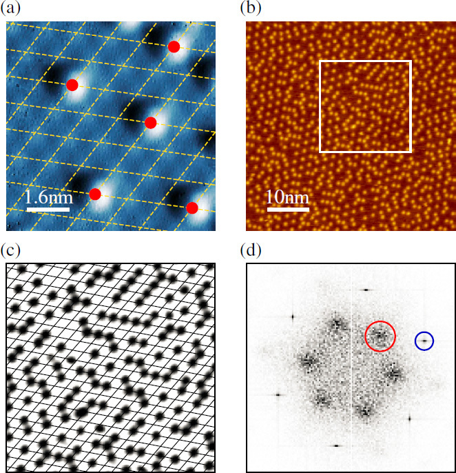 图 2: (a) 低覆盖度下1T-TaS2表面K原子的吸附位置;(b) 高覆盖度下(金属化表面)K原子的吸附位置;(c) 从(b)中的白色正方形区域提取的K原子吸附位置;(d) STM图像(b)的傅立叶变换。