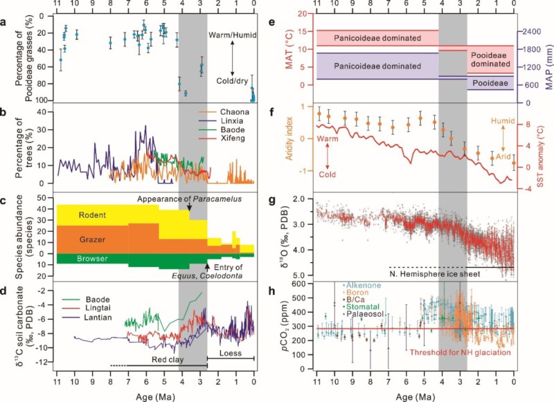 以博士生王翰林为第一作者、鹿化煜教授为通讯作者发表在Nature Communications的研究论文,通过对渭河盆地沉积物植硅体的系统研究,发现在上新世末期(距今约300万年前后)植被中的草类增多,并占据主导地位,与之前的森林草原植被相比,气候变干、季风降水减少28%。同时,他们通过全面的现代植被-气候数据分析,提出当时的全球温度降低、抑制了亚洲季风环流,中国北方气候变干。这一结论为上新世末期气候变干还是变湿的争议提供了关键证据。同时,他们提出当时全球温度降低是控制季风强度的主要因素,不同于长期流行的青藏高原快速抬升驱动季风降水增多的观点。这一结果得到国际权威专家的高度认可,是地理与海洋科学学院师生独立完成的一项重要研究工作。