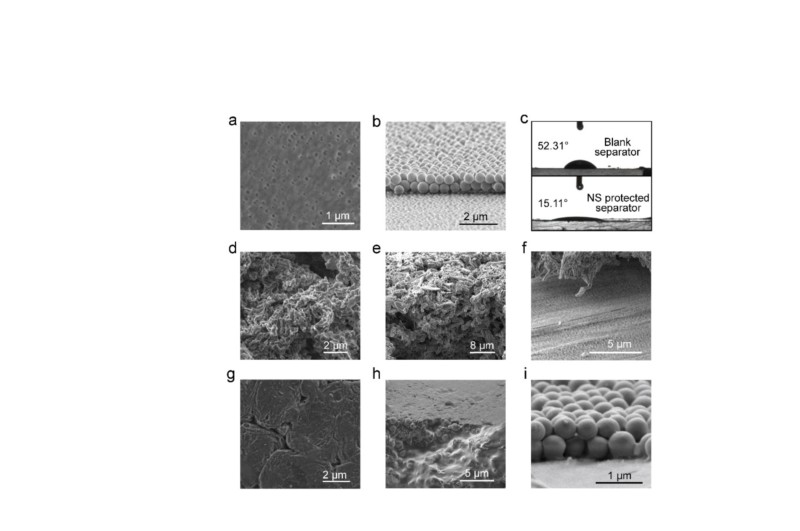 图表 2 a-b)空隔膜与纳米盾牌隔膜循环前的SEM图;c)空隔膜和纳米盾牌隔膜的电解液接触角测试;d-f)空隔膜电池循环200圈后的金属锂电极的表面,截面和隔膜的SEM图;g-i)纳米盾牌隔膜电池循环200圈后的金属锂电极的表面,截面和隔膜的SEM图。