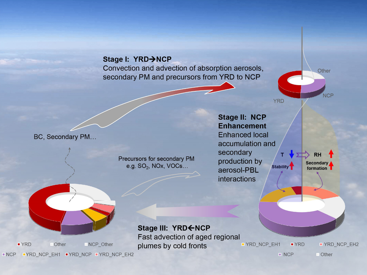 该研究首次发现在上千公里的空间尺度上,垂直方向的空气污染-大气边界层反馈过程可以与大尺度天气过程发生相互作用而进一步增强区域间的污染传输。该项工作是丁爱军与符淙斌团队在前期"黄泥天"形成机制以及超大城市黑碳气溶胶"穹顶效应"等工作基础上的拓展和又一重要突破。该研究进一步证明了我国独特环境条件下大气复合污染成因的复杂性和非线性,而基于多学科交叉(特别是大气物理、气象和大气化学交叉)的方法以及多手段(包括地面观测、垂直立体探测以及先进的数值模拟技术)的结合可帮助提高相关问题的认识。